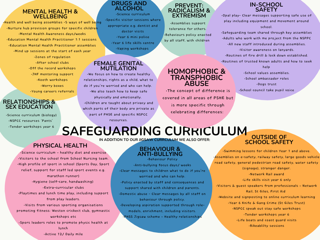 Our curriculum gives pupils opportunities: to experience life in all its diversity; to acquire knowledge; understanding and skills that significantly impact on personal development, behaviour and welfare. Our PHSE curriculum covers all areas of Safeguarding through each of the strands but is sensitive in recognise that some subjects are more sensitive subjects than others and need to be taught at an age-appropriate level, or within a small group or 1:1 level where a more urgent need arises. Our wider whole school opportunities include our assembly programme, various enrichment weeks/days and the application of whole school culture and expectations e.g. behaviour policy enacted in each classroom.