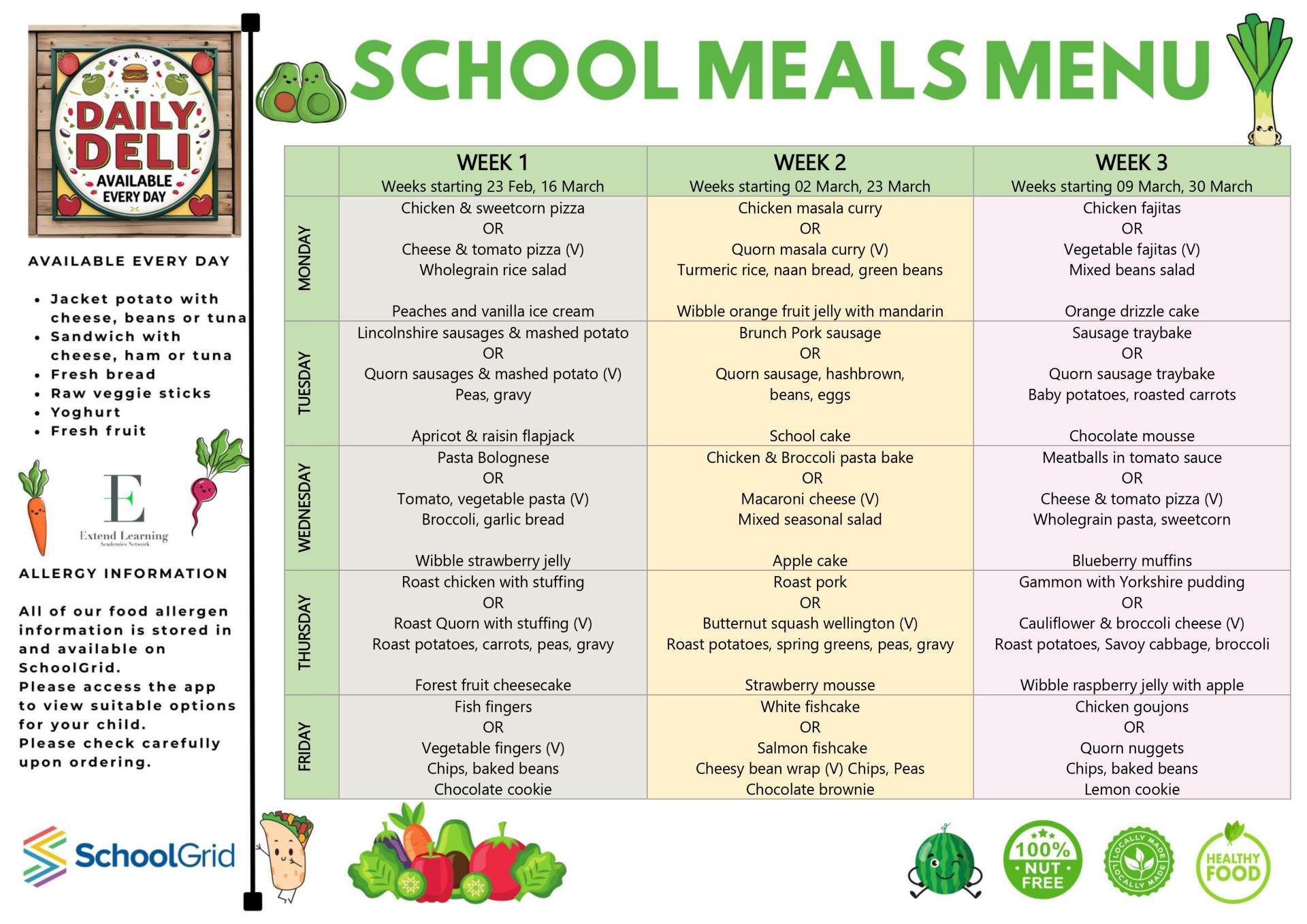 There will be a meat choice, a vegetarian choice, jacket potatoes sandwiches and hot pasta choice. Parents are able to book and pay for meals directly with School Grid.
