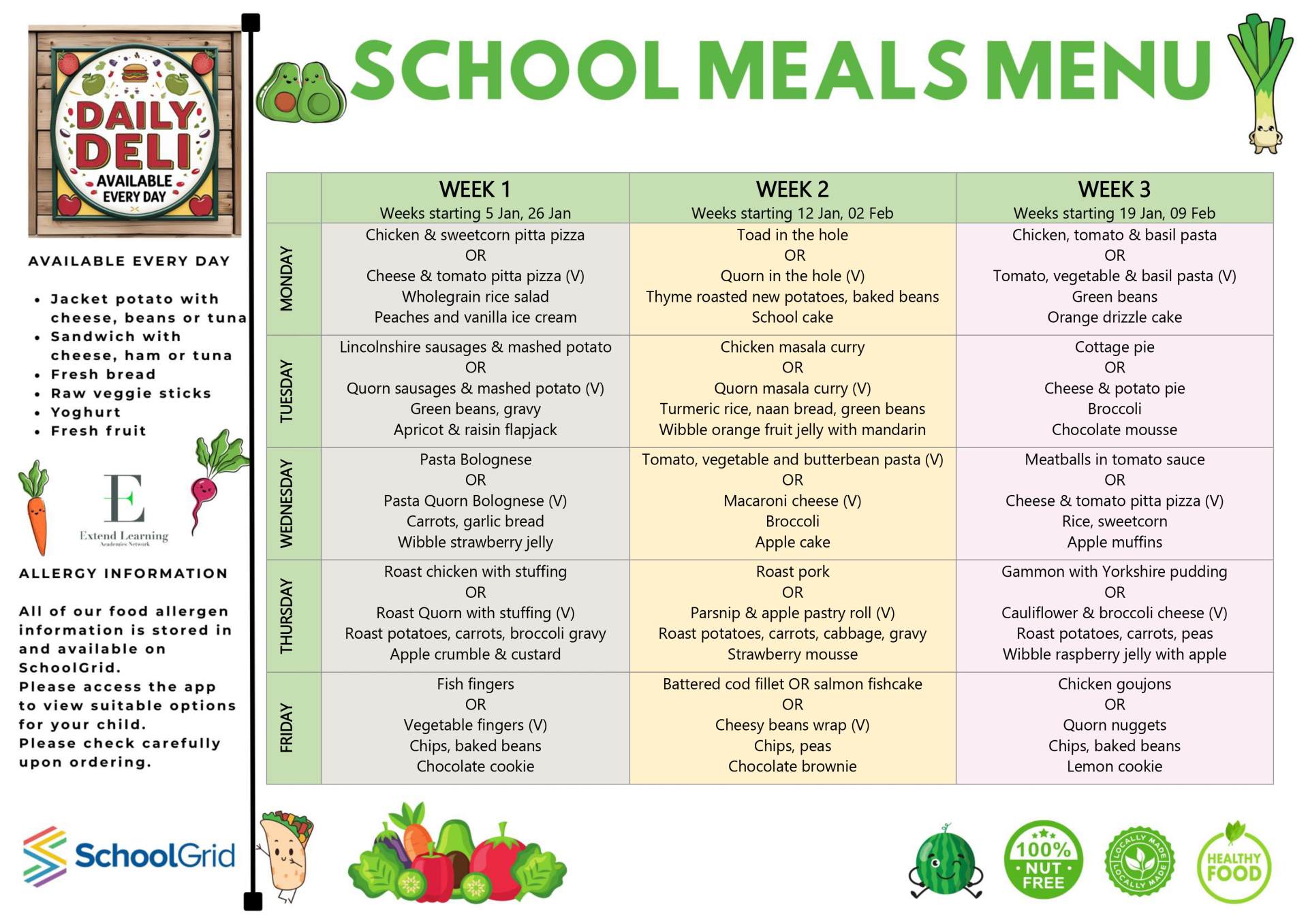 There will be a meat choice, a vegetarian choice, jacket potatoes sandwiches and hot pasta choice. Parents are able to book and pay for meals directly with School Grid.